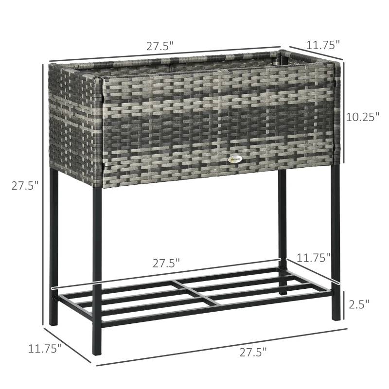 Grow in style with this Elevated Modern Rattan Wicker Raised Garden Planter Box! Tend to your plants at a comfortable height by using an outdoor flower stand. This planter box keeps plants up and away from wild animals and stops strain on your knees and back. This raised plant hold can be moved inside for the winter, keeping your shovel in the soil, and extending the growing season. The plant pot holder is made of PE rattan, a material that offers all the handwoven charm of classic wicker with better resistance to water and weather. A bottom shelf provides an area for flower pots, seeds, soil, shovels, or anything else.