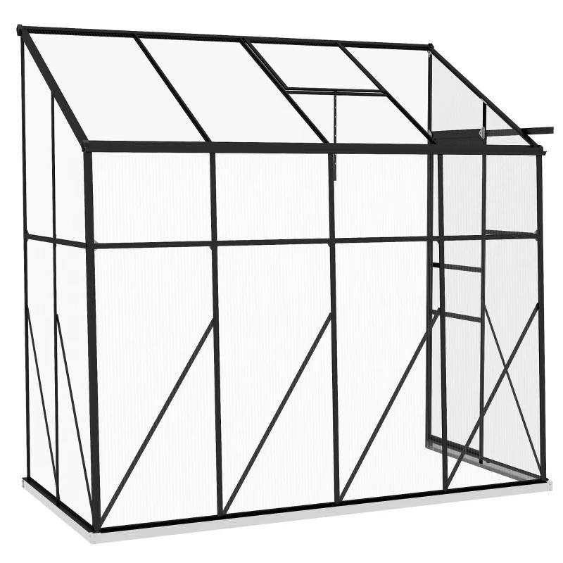 Want to grow better? Go with this 8.3 ft x 4.1 ft Outdoor Polycarbonate Lean-to Greenhouse with Black Metal Frame. Our spacious walk-in, lean-to greenhouse features twin-wall polycarbonate to protect plants from wind, cold, rain, UV scorching, and wild animals. Lean our greenhouse up to an existing structure such as your house, fence, shed, or garage. When you do, it will gain supplemental strength. A sliding door makes it convenient to enter, and there's an adjustable vent on top; together, they give you greater control over humidity inside.
