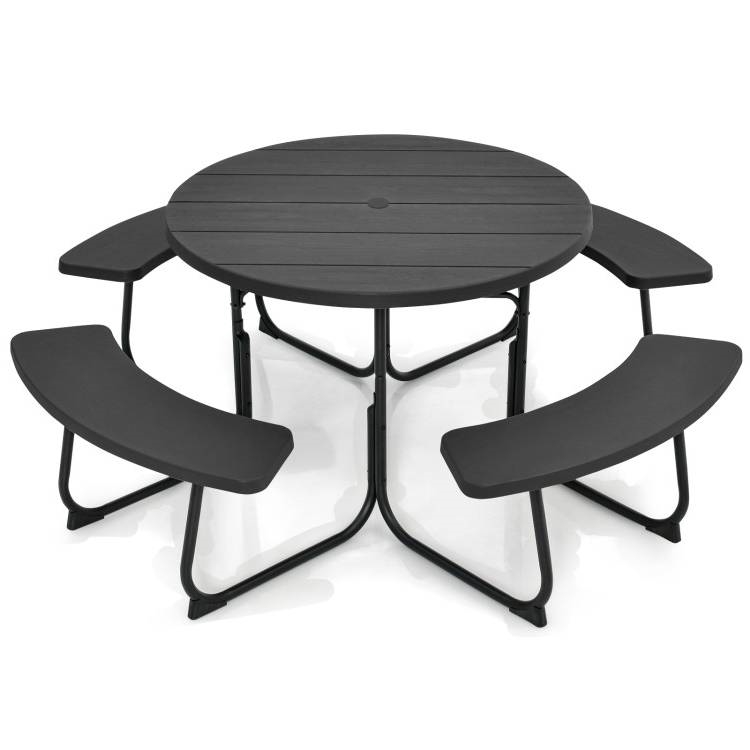 The 43" round table Black All Weather 8 Seater Picnic Table Umbrella Hole can comfortably seat up to 8 adults. Whether you're hosting a barbecue or enjoying an outdoor meal, the picnic table provides the perfect gathering place for your family and friends. The selected HDPE material exhibits excellent resistance to cracking and fading, ensuring its durability and making it a dependable choice for long-lasting outdoor use. The picnic table bench set is supported by a powder-coated metal frame and has excellent rust resistance and stability. The u-shaped legs and reinforced x-structure provide reliable support. Besides, there exist non-slip protectors to avoid scratching to the floor. Featuring a 1.9" hole, the round picnic table set allows you to install a patio umbrella. Hence, you can create a shaded area to enjoy a delightful meal without harsh sunshine. With the wood-like appearance and enhanced durability, the outdoor picnic table blends seamlessly with any outdoor setting, such as your yard, lawn, poolside, or garden.